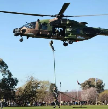 资料图片:在澳大利亚堪培拉的澳大利亚国防学院拍摄的直升机绳降展示。新华社发(储晨摄)